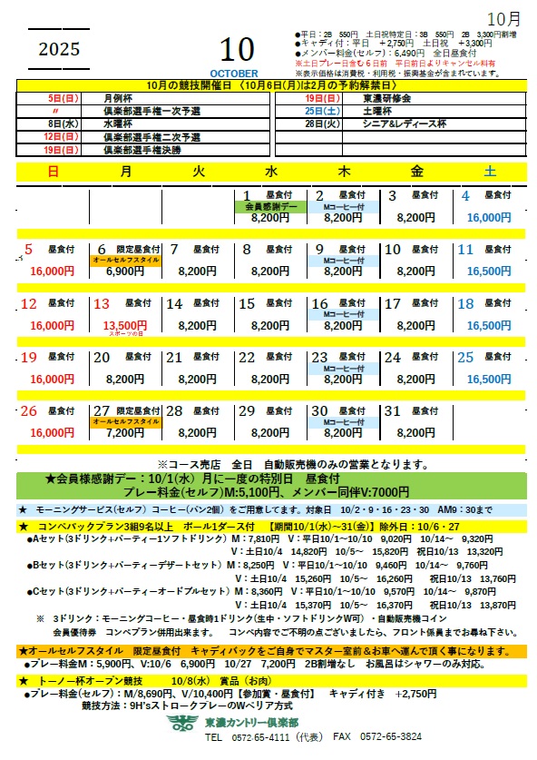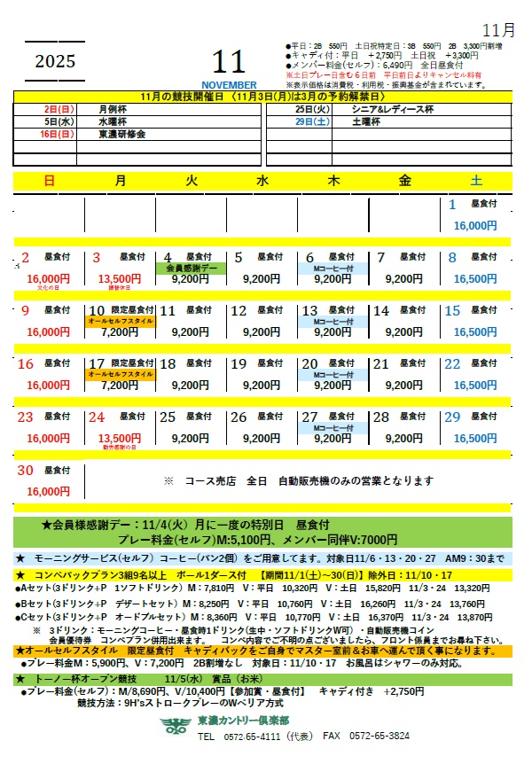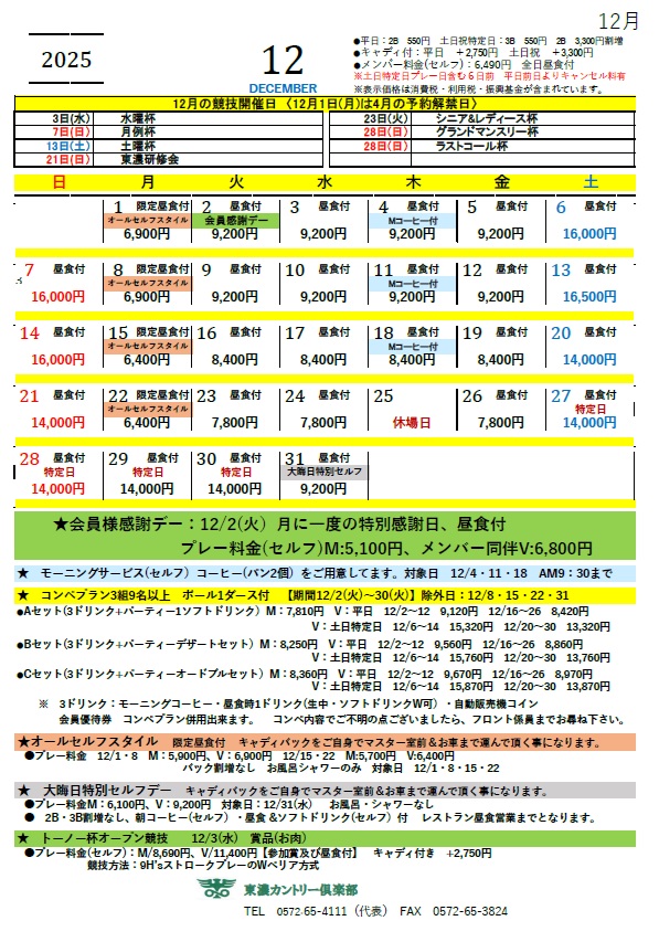 1月〜2月は、特定日を除きキャンセル料を頂きません。但し、倶楽部競技のみ当日キャンセルの場合はキャンセル料1,000円頂きます。