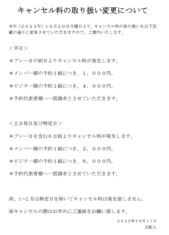 2025年10月20日よりキャンセル料の取り扱いを変更致しました