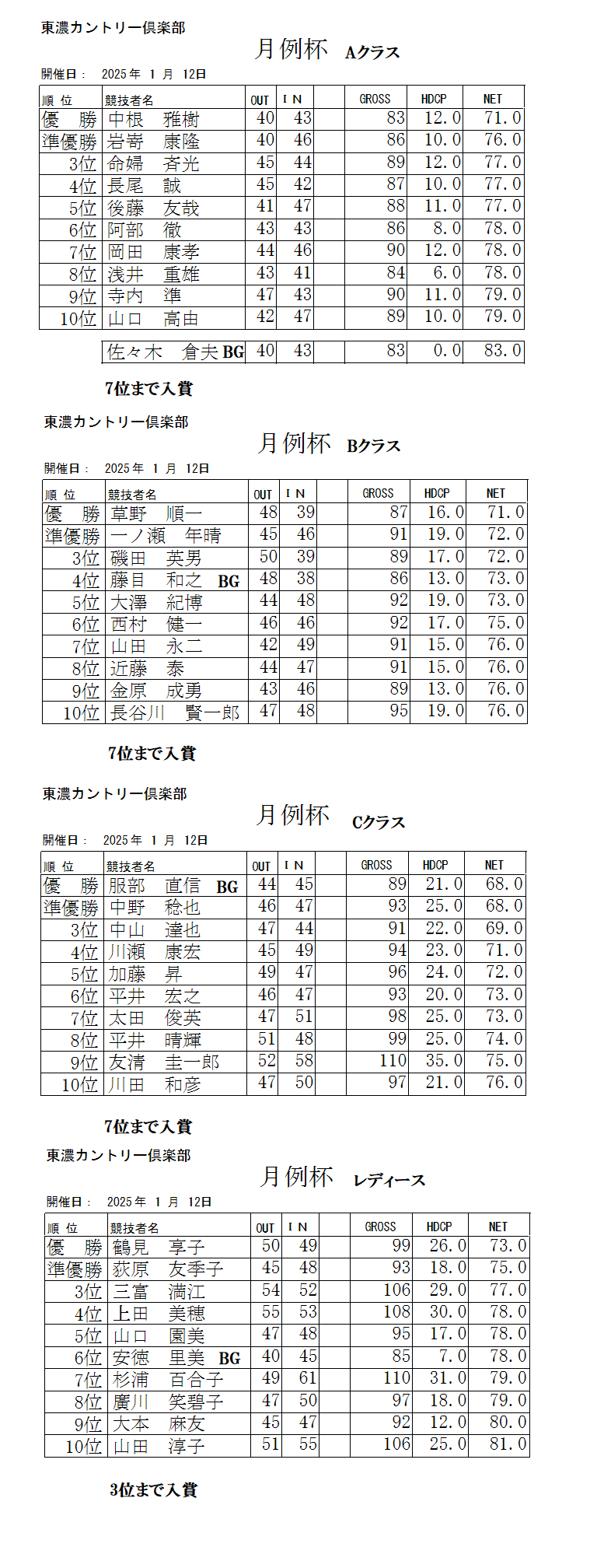 2025年1月月例杯成績表