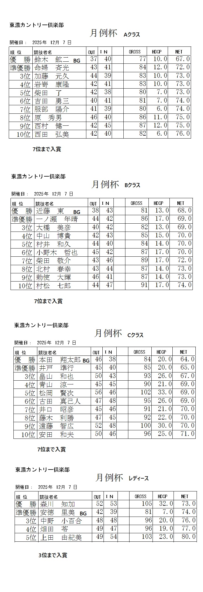 2025年12月月例杯成績表