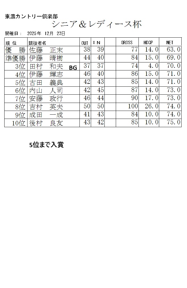 2025年12月シニア&レディース杯成績表