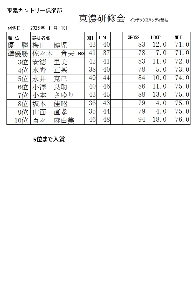 2026年1月東濃研修会成績表