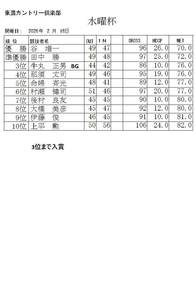2026年2月水曜杯成績表