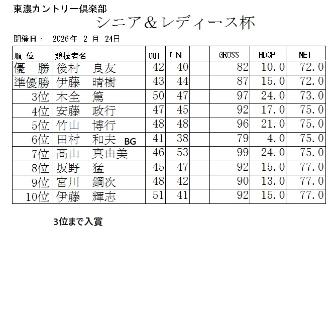 2026年2月シニア&レディース杯成績表