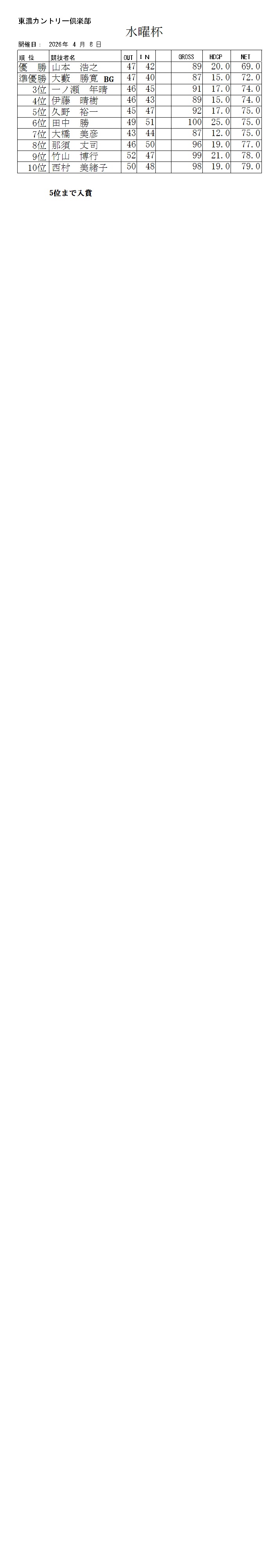 2026年4月水曜杯成績表
