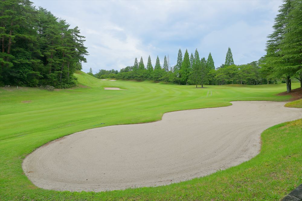 左ドックレックの上りのロングホールです。ティショットは正面の3本木狙い。